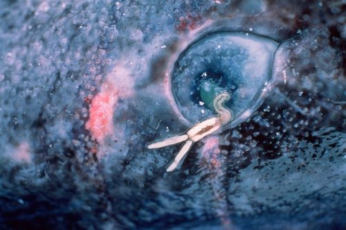 거의 모든 그린란드상어는 시력이 없는데, 그 이유는 그린란드상어의 눈에 기생하는 요각류(橈脚類, 굽을 요, 다리각, 무리 류) 기생충 때문이다. 이 기생충은 오로지 그린란드상어의 눈에만 기생하며 그린란드상어의 시력이 완전히 없어질 때까지 안구 표면을 갉아먹는다. 이렇게만 보면 이 기생충은 그린란드상어 입장에서는 해롭기만 한 것 같지만, 놀랍게도 그린란드상어와 이 기생충은 공생, 그것도 상리 공생 관계에 있다는 사실이 밝혀졌다. 이 기생충은 몸에서 빛을 발산하는데, 이 빛에 모여든 먹이를 그린란드상어가 잡아먹는다는 것. 어차피 그린란드상어가 사는 심해는 굉장히 어두워서 일반적인 시력이 무의미한 수준이라 상어 입장에서도 좋은 일이다. 최근에는 이 기생충이 그린란드상어의 먹이사냥에 딱히 도움이 되지 않는다는 주장도 존재하니 교차 검증이 필요할 것으로 보인다.